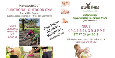 Mit mom&me können Frauen und Kinder fit in den Sommer starten - zum Beispiel mit den Functional Outdoor Gym speziell für Frauen (Beckenbodenschonend) immer Dienstags um 09:00 Uhr mit Susanne oder der neuen Krabbelgruppe, die ab 03. Juli startet.