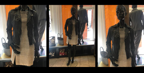 Wollt ihr euch trotz des anstehenden frühlingshaften Wetters nicht zu farbenfroh kleiden, aber dennoch frisch und trendig aussehen? Dann ist das Outfit mit einem geringelten kurzen Kleid von "Imperial" mit einer coolen Lederjacke von "Freaky Nation" genau das Richtige für euch!