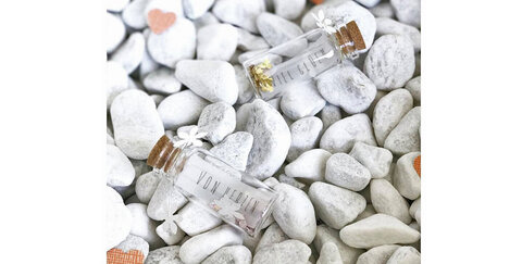 Auf dem Bild sind kleine Glasflaschen mit Botschaften zu sehen - ein goldenes 'Viel Glück' und ein silbernes 'Von Herzen'.